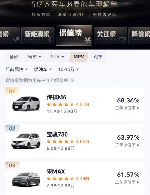 此外,传祺M6 MAX的高保值率也是其成为价值新标杆的重要因素之一。根据权威媒体机构最新的汽车保值率排行榜,传祺M6系列以68.36%的三年保值率稳居同级别MPV之首。